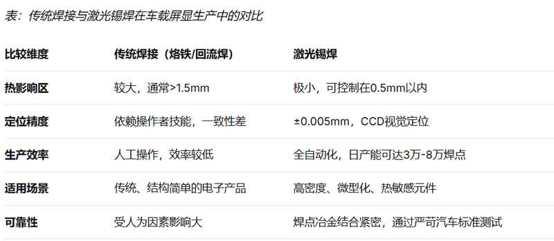 激光锡焊之所以能够成为车载屏显制造的首选工艺,是因为它精准匹配了汽车行业对电子产品的严苛要求。