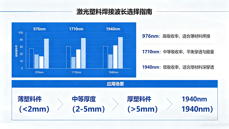 976nm:成熟经济,适合深色/不透明塑料,或可自由添加吸收剂的场景,适用于汽车电子、通用电子等对成本敏感的批量焊接;